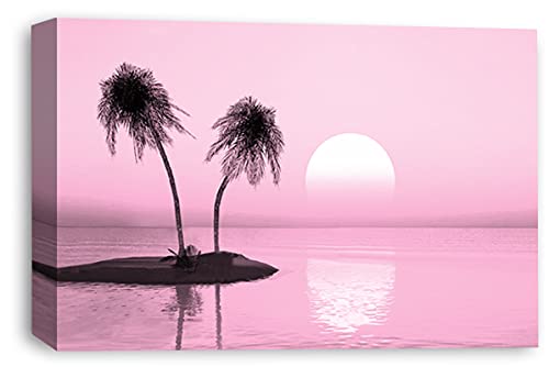 LR Sunset Beach Wall Art Pink Palm Trees Tropical Island Framed Canvas Picture Ready to Hang